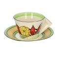 クラリス・クリフ「ムーンライト」円錐形コーヒーカップとソーサー 三角形のハンドルと、カップに「ムーンライト」パターンが描かれた装飾が特徴で、ソーサーと一致しています。「Fantastique, Bizarre by Clarice Cliff」と両方の底にマークがあります。 良好な状態で、軽微な摩耗があります。ソーサーにチップがあります。