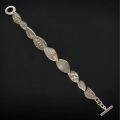 様々なサイズの重なり合う葉形リンクが9つあり、磨かれた、テクスチャード、ハンマードのデザインが施されたシルバーリンクブレスレット。デコラティブなトグルスタイルの留め具付き。一つのリンクと留め具に刻印あり。状態良好、わずかな使用感。