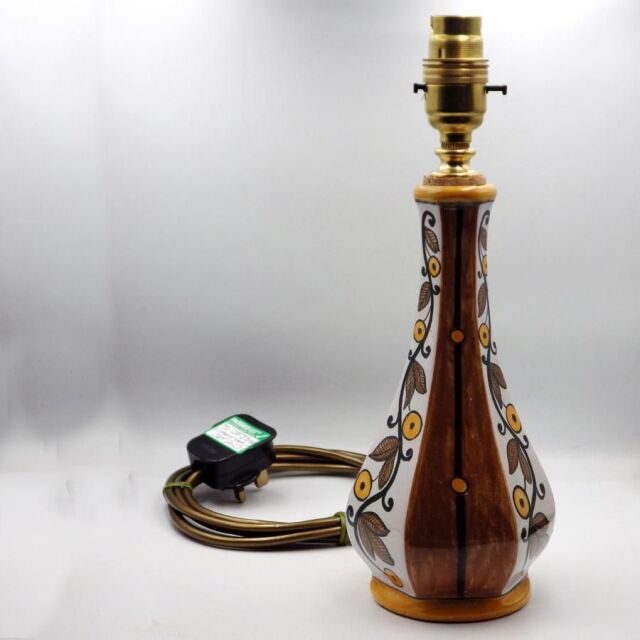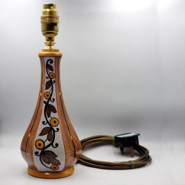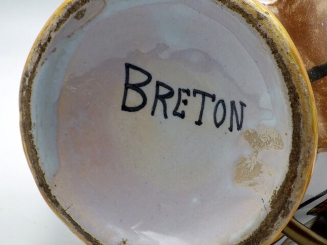 オリジナルのアールデコ時代のフレンチファイアンス多色塗装テーブルランプ、Bretonのサイン入り。1930年代に製造。新しい真鍮製バルブホルダーが取り付けられています。素晴らしいテーブルランプ。