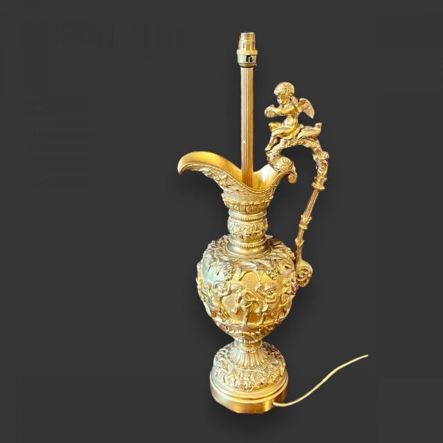 20世紀初頭のフランスまたはイタリアのルネサンス様式の金鍍金ブロンズのケルブの水差しテーブルランプ。葉とケルブの装飾が施された金鍍金の水差し。装飾的なハンドルの上にケルブのフィギュア。重厚な品質。