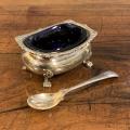 塩と皿のスプーンに青いライナー。Goldsmiths of Londonの刻印が、品質の高さを物語ります。