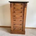 7つの引き出しは、収納力も抜群。アカンサスの葉の彫刻が施された柱や、台座部分のデザインも、当時の職人のこだわりを感じさせます。