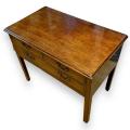 1760年頃に作られた、18世紀のマホガニー製三段引きローボーイです。面取りされた脚、真鍮製の取っ手が付いたオーク材の引き出しが特徴です。
