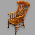 ヴィクトリア朝時代のグランドファーザーチェアです。高い背もたれに、透かし彫りの背板、エルム材の座面が特徴です。回転式の支柱、脚、二重のH型貫が、安定感と重厚感を醸し出しています。