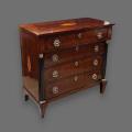 19世紀初頭の寄木細工象嵌マホガニーチェストは、4段の引き出しに、華麗な装飾の取っ手、下部3段を挟むハーフコラム、側面と天板には貝殻模様の象嵌が施された逸品です。