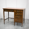 1910年代、英国で作られたマホガニー材のアンティークデスクです。丁寧に磨き上げられた美しい木肌と、上品なゴールドの取手が目を引きます。
