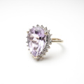吸い込まれるような淡い紫色の輝きを放つ、天然アメシストのアンティークリング。涙の形をしたペアーシェイプミックスカットの大粒アメシストが中央で存在感を放ち、その周りを繊細なダイヤモンドが取り囲んでいます。