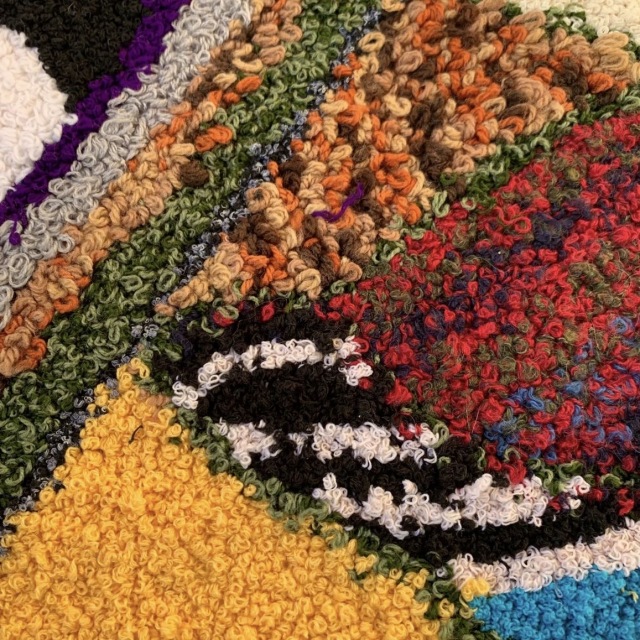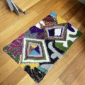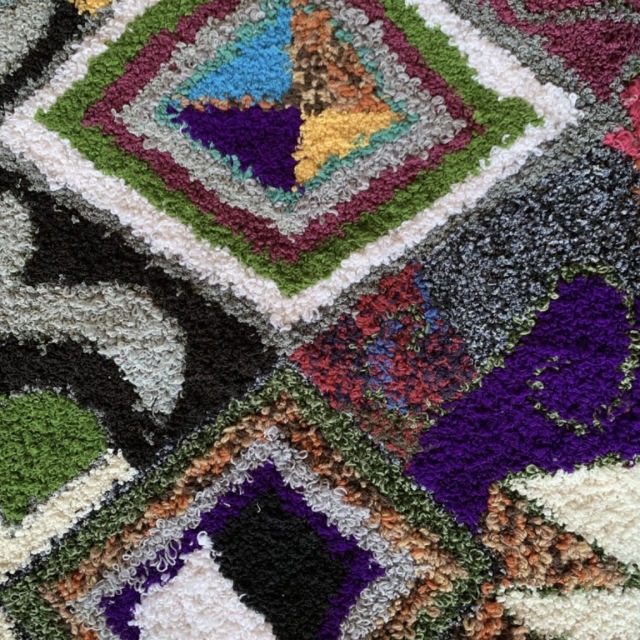 ZINDEKH(ジンデッキ)と呼ばれるこのラグは、シリアルや小麦粉、穀類が入っていた袋をベースに、ユーズドのセーターなどをほぐして手作業で編み込み、100%リサイクルの素材で作られたオリジナルな作品です。