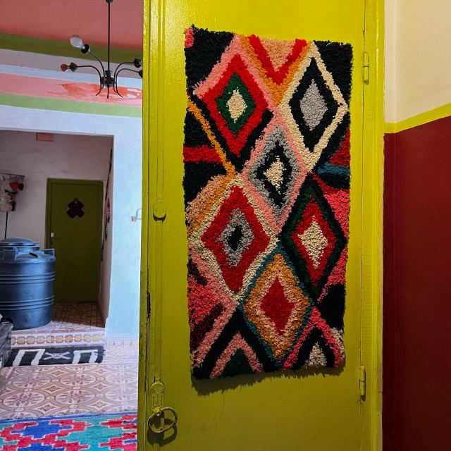 これらのラグは、マラケシュの南にある山奥の小さな集落の、各家庭で作られています。文化的、宗教上の理由でその集落には観光客などが立ち入ることはできず、そのエリアは極めて神秘的な場所となっています。レオアトランテのデザイナー達はモロッコのTiznitに住んでおり、その集落の知り合いを通じてアクセスが可能なため、今回の買い付けが可能となっています。