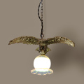 このペンダントライトは、ヴァセリンガラスと真鍮(銀メッキ)を使用しており、その独特の美しさと精巧なデザインが特徴です。特に注目すべきは、真鍮で作られた鷲がシェードを掴んでいるデザインで、この細部まで凝った造形が、当時の職人技術の高さを物語っています。
