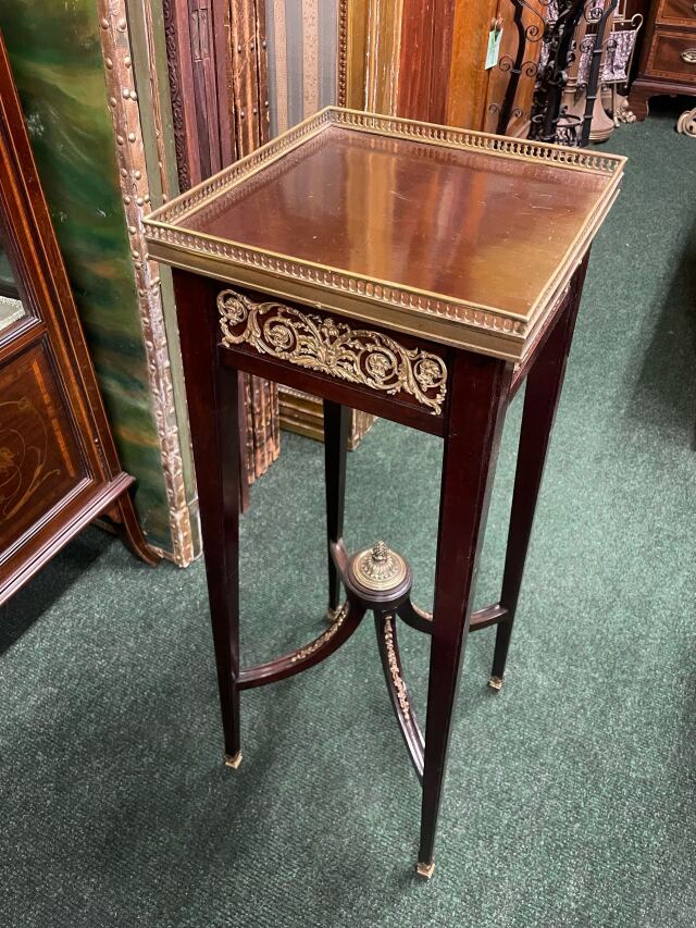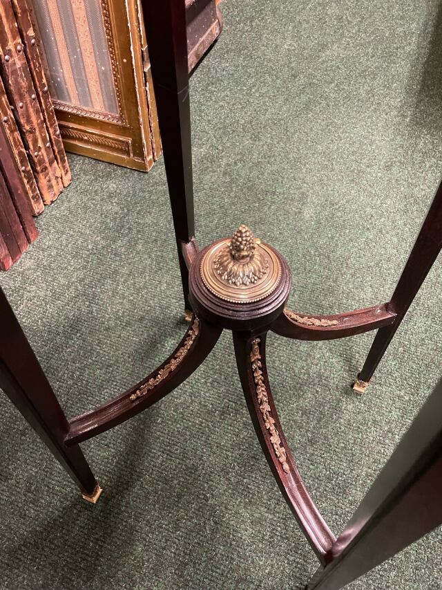 1890年代フランス製の、マホガニーと真鍮で作られたアンティークのプラントスタンドです。天板や脚部分に施された繊細な彫刻が、まるで芸術作品のよう。マホガニーの温かみと、真鍮の光沢が上品なコントラストを生み出しています。アンティークならではの味わいは、年月を重ねるごとに深みを増していきます。お気に入りの観葉植物を飾れば、お部屋の雰囲気が一層華やかになります。フレンチアンティークならではの優雅なデザインをお楽しみください。