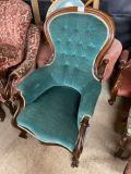 1880年代のイギリスで作られたマホガニー材のチェアです。ヴィクトリア時代に流行したチェスターフィールドデザインに、珍しいブルーの革張りがあしらわれた、非常に貴重な一品です。