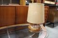 1960年代の英国製チーク材テーブルランプ。麻調のランプシェードと、様々な色で組み上げられた木の土台の組み合わせが、温かみのある光を放ちます。