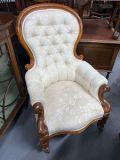 ファブリックと全体のフェミニンなフレームのデザインが素敵なビクトリア時代のアンティークチェア。