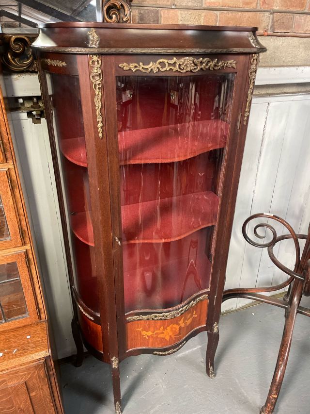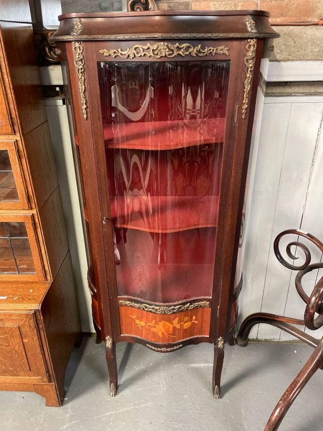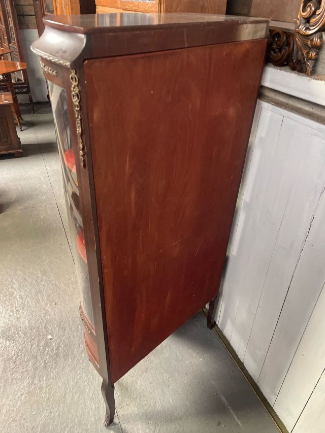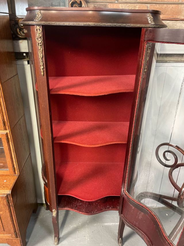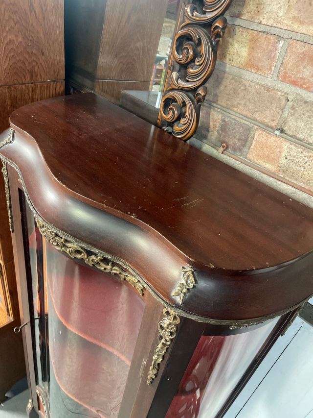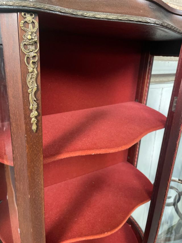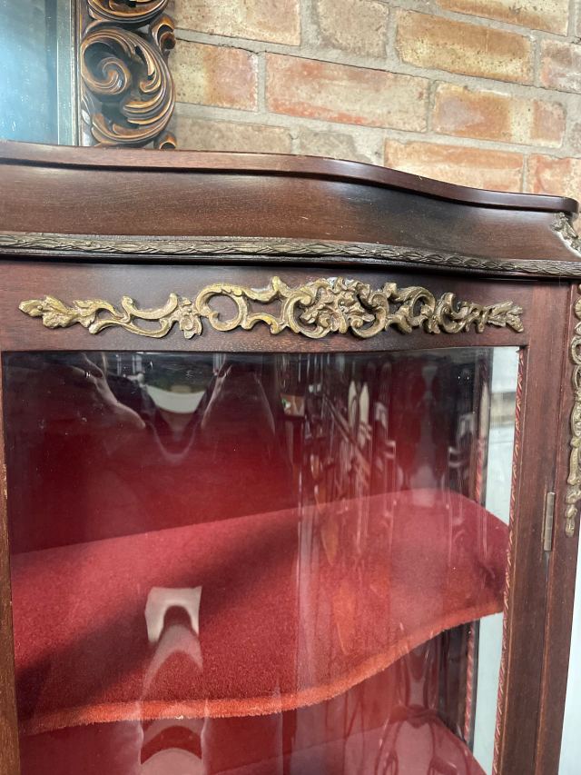 ガラスキャビネットとしての機能も優秀で、クリアなガラス扉が中のコレクションやアンティークアイテムを美しく展示します。棚の配置や装飾も非常に細かく作り込まれており、ディスプレイアイテムを引き立てるのに最適です。内部の照明をあしらえば、さらに華やかに演出することもできます。