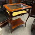 1890年代イギリス製のマホガニー材のガラスキャビネットです。蓋部分には美しいインレイが施され、まるで宝石箱のような輝きを放ちます。