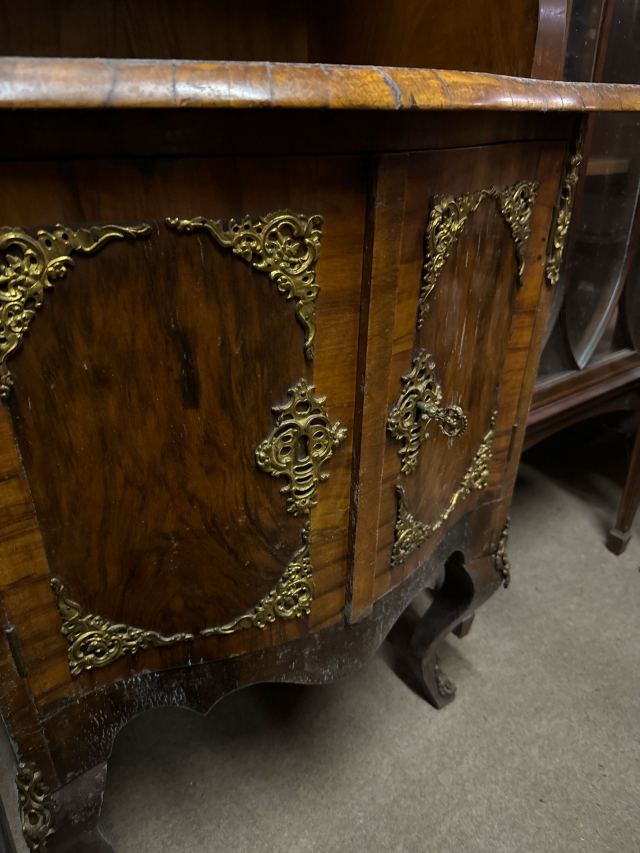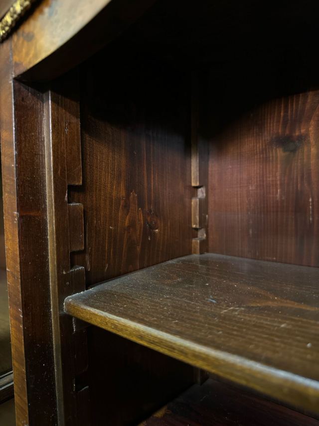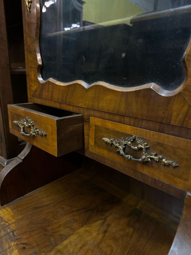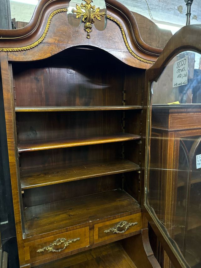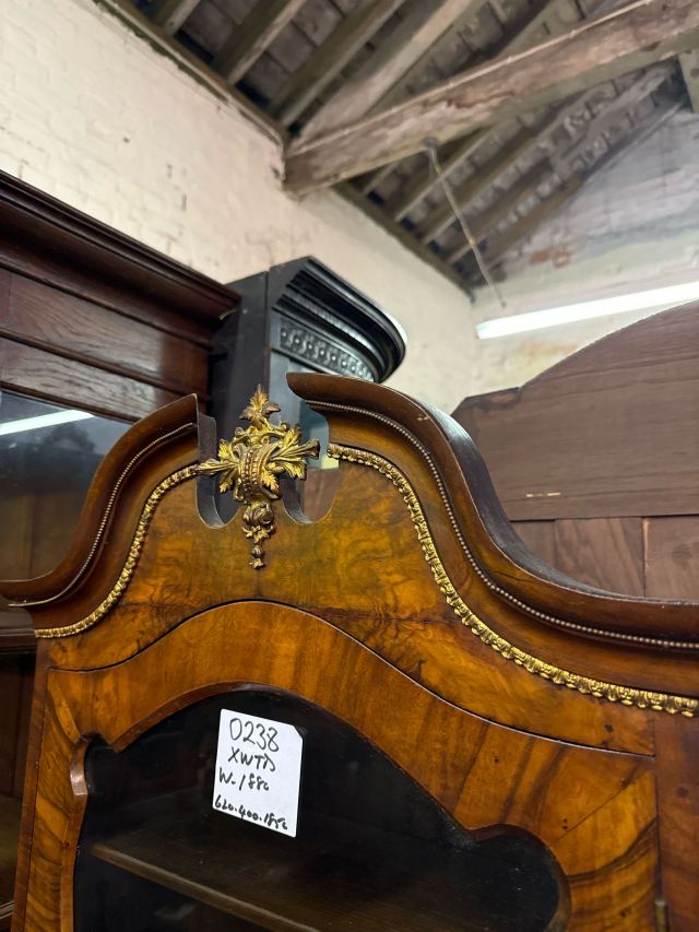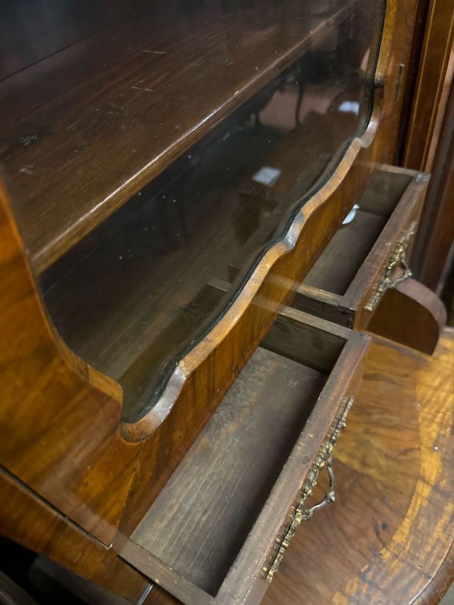 1880年代のウォールナット製のガラスキャビネットです。上部のガラス扉からは、中のコレクションを美しくディスプレイできます。小さな引き出しが2つ付いており、アクセサリーなどの収納に便利です。棚板は高さ調整が可能なので、収納物に合わせて自由にレイアウトできます。上部や取手の繊細な装飾が、アンティークならではの優雅さを醸し出しています。経年変化による味わいと、ウォールナット特有の深みのある色が魅力です。