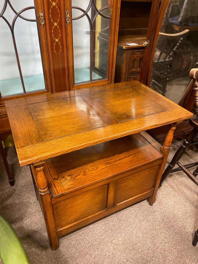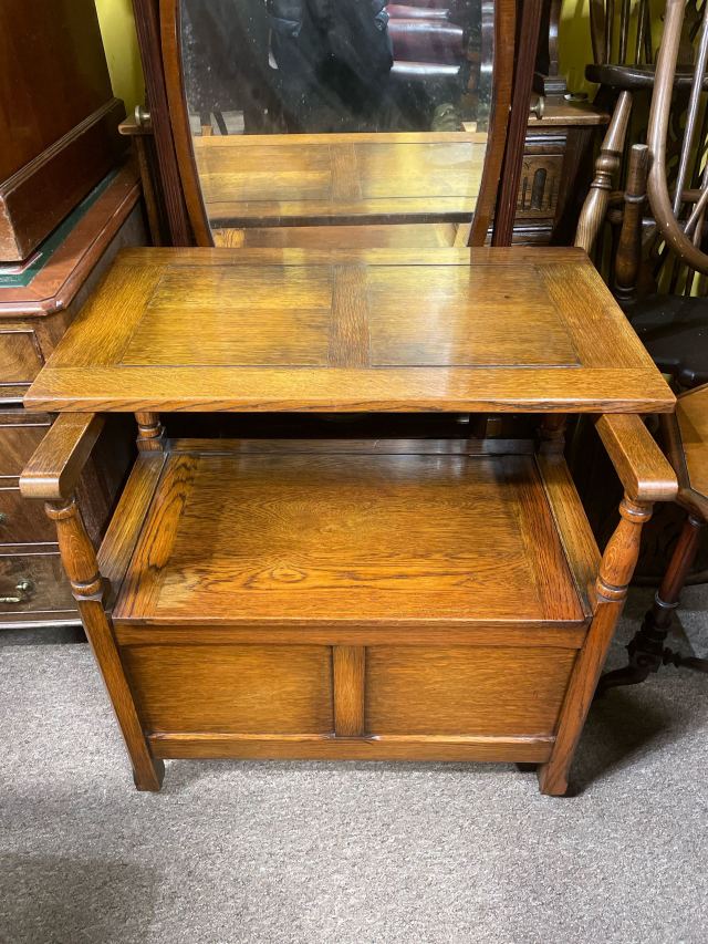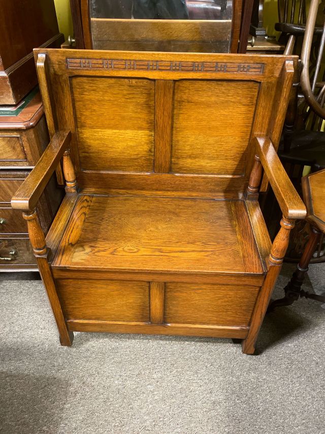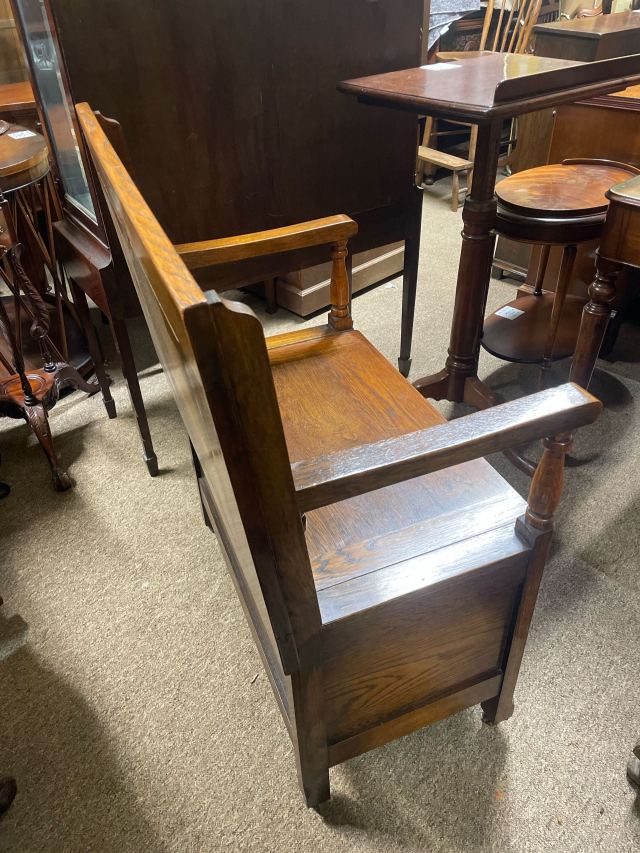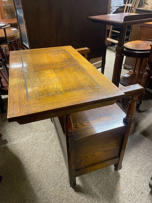 1930年代イギリス製の、オーク材で作られたコンパクトなベンチです。小さめサイズなので、どんなお部屋にも合わせやすいのが魅力です。収納スペースがあるので、ブランケットや雑誌などを収納できます。さらに、背もたれを倒せばテーブルとしてもお使いいただけます。オーク材の温もりと、経年変化による味わい深い木目が特徴です。書斎やリビングに置いて、読書を楽しんだり、ティータイムを過ごしたりするのにぴったりです。
