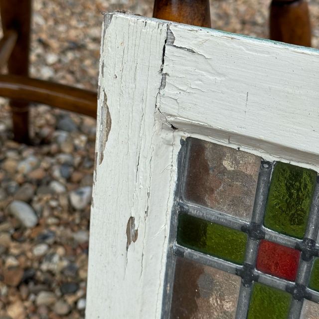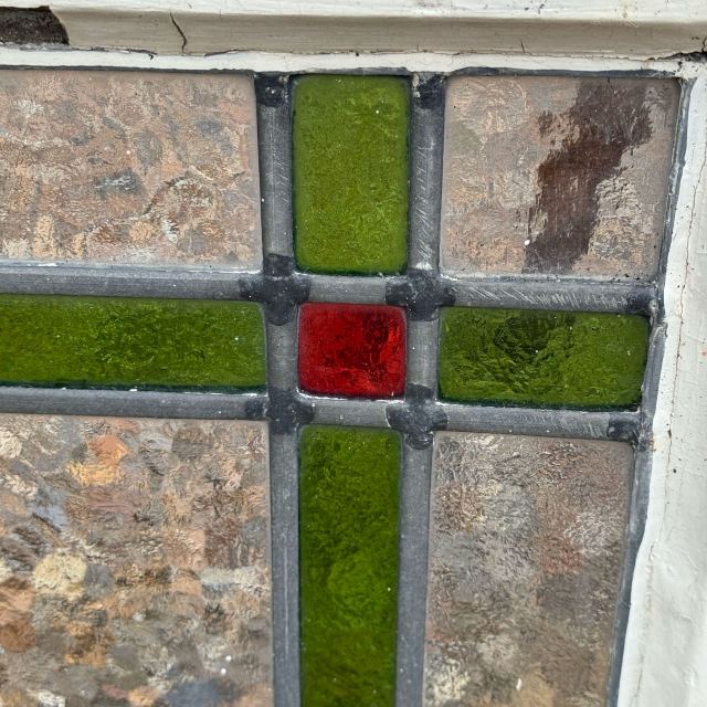 1900年代イギリス製のステンドグラスです。赤と緑の鮮やかなコントラストが美しい、印象的な一枚。