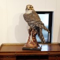 鷹匠のグローブに鋭い眼差しで止まるハヤブサを、細密な彫刻で表現。羽の一枚一枚からグローブの質感に至るまで、驚異的な技巧で作り込まれています。