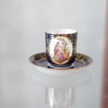 深みのあるコバルトブルーと豪華な金彩、そして手描きの絵画が織りなす芸術的なデミタスセットです。