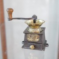 重厚な鋳鉄製の本体に、華やかな真鍮製のホッパー、使い込まれた風合いの木製ハンドルを組み合わせたクラシックな造りです。