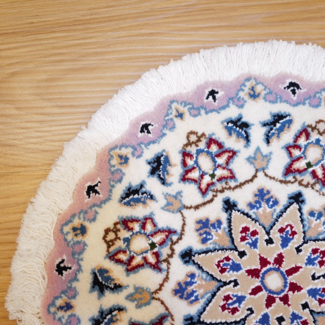 ナイン産 ペルシャ絨毯 円形メダリオンラグ 約41×40cm ウール100% 手織り 高密度 アイボリー×ブルー